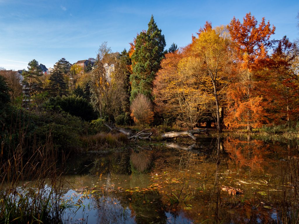 Als ich dieser Tage vormittags durch den Alten Botanischen Garten in Marburg wanderte, da befiel mich mit einem Mal ein Gefühl, dass ich sonst eher nur dann erlebe, wenn ich aus einem meiner bekloppten Träume erwache – Verwirrung! Man muss dazu einerseits wissen, dass ich mich – wenngleich wir natürlich alle träumen – so doch nur äußerst selten an den Inhalt meiner nächtlichen Ausflüge in Morpheus’ Reich erinnern kann; dass ich jedoch andererseits zumeist dann so einen oberwirren Kladderadatsch im Kopf habe, dass ich nicht umhin komme, zu mir selbst “HÄH?” zu sagen. Nun jedoch habe ich das am hellichten Tage erlebt. Und ich könnte nicht behaupten, dass ich gerade am Tagträumen gewesen sei. In Gedanken versunken vielleicht, aber mehr auch nicht. Und dennoch schien die Atmosphäre mich auf besondere Art zu berühren. Vielleicht lag es daran, dass der zähe Hochnebel alles in ein wenig mystisches Grau gehüllt und den Lärm der nahen Straßen ein wenig gedämpft hatte. Eine Art Entkopplung vom Alltag. Sicherlich spielte auch eine Rolle, dass ich mich bewusst darauf eingestellt hatte, meine Sinne offener zu lassen als sonst. Unter normalen Umständen sind meine Wahrnehmungsfilter eher eng eingestellt. Insbesondere dann, wenn ich durch größere Mengen von Menschen navigieren muss und diese auch noch nahebei umhermäandern. Habe ich hier schon mal erwähnt, dass mich die meisten Menschen ziemlich anstrengen…? Nun war ich aber in dieser mäßig ausgedehnten Grünanlage weitestgehend allein unterwegs, so dass ich mir erlaubte, mich auf den Ort einzulassen – und plötzlich begann ich mehr zu bemerken als sonst. Mehr Details, mehr Tiefe, intensivere Eindrücke. Das war die Ursache meiner Verwirrung.